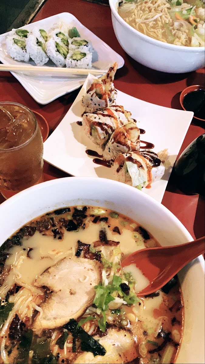 The menu is broad, appealing to a range of Japanese food enthusiasts. If ramen is your go-to, the Tampopo Ramen or Spicy Ramen stand out with their rich chicken and pork bone broth bases, while the Vegetarian Ramen offers a lighter but equally satisfying alternative with vegetable-forward ingredients. Sushi lovers will find options from rolls like the Nuclear Bomb and Tampopo Roll to spider and shrimp tempura rolls, providing both classic and inventive bites. Bento boxes, like the Chicken Teriyaki and Sesame Chicken Bento, make for well-rounded meals complete with rice, miso soup, and salad—practical for lunch breaks or casual dinners.