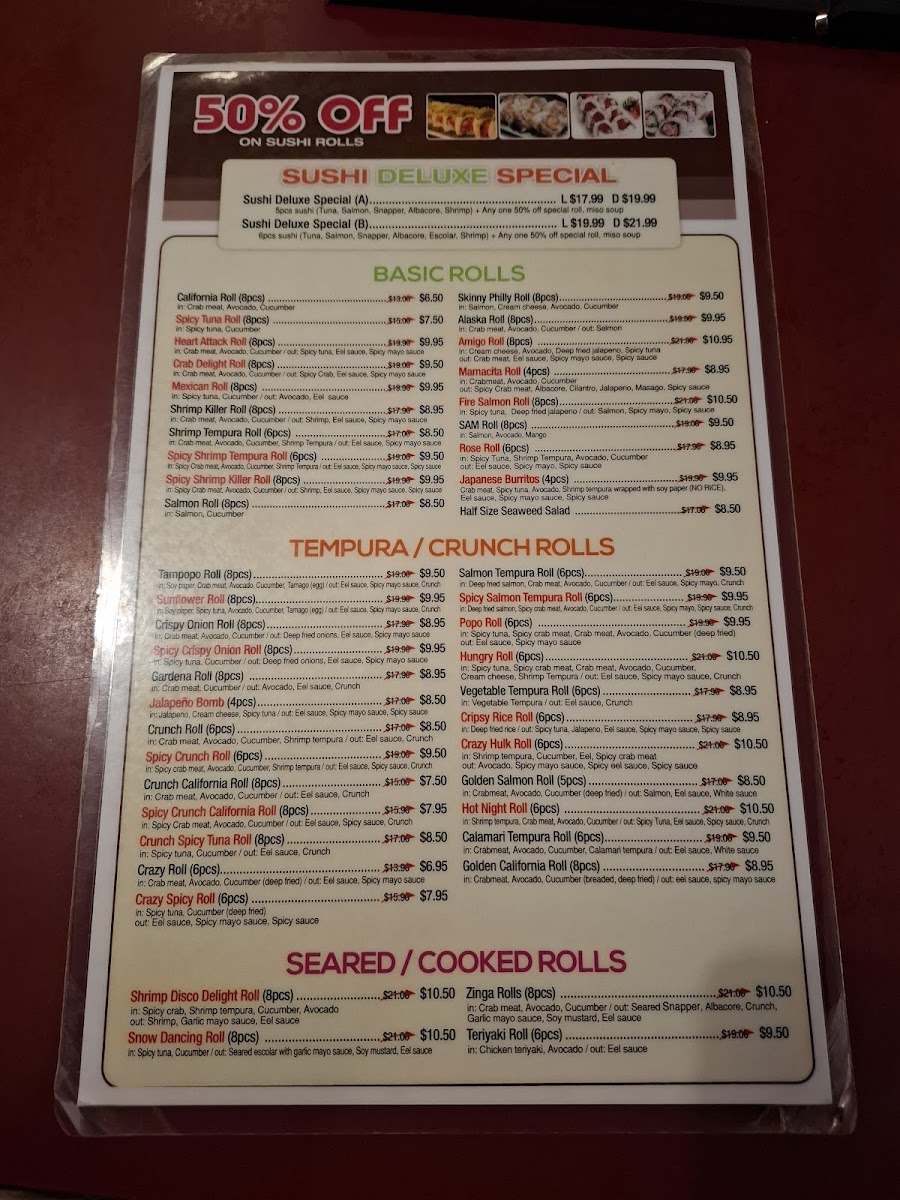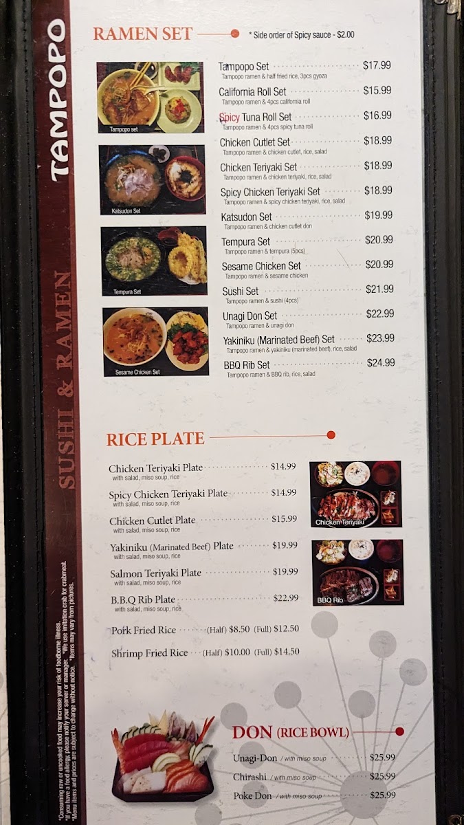 This menu suits lunch and dinner occasions, with both quick options and more elaborate combinations. The variety allows for casual dining experiences, accommodating guests seeking ramen, sushi, or complete rice plate meals. The range of set meals and combos supports customers who prefer efficient ordering without sacrificing variety.