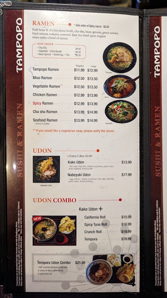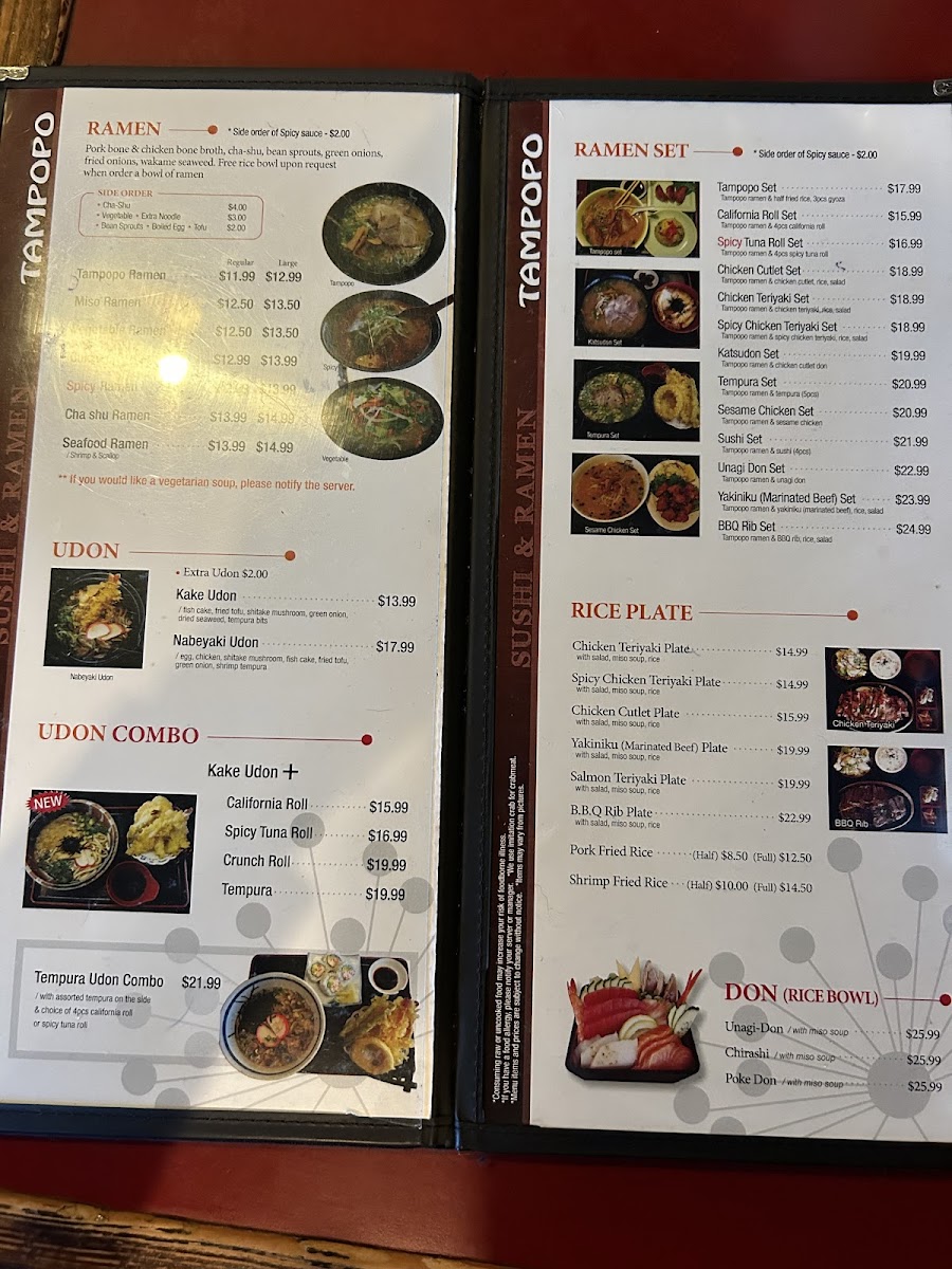 - Ramen and Udon: The menu highlights include several ramen varieties like Tampopo Ramen, Vegetarian Ramen, and Nabeyaki Udon, catering to both traditional and vegetarian preferences.