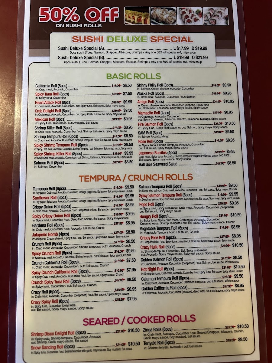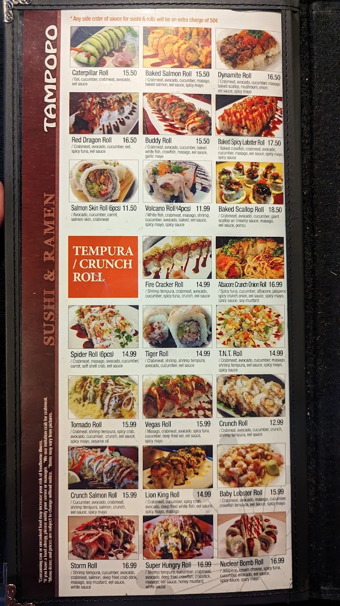 - Tempura and Crunch Rolls: This section features specialty rolls like the Storm Roll, Super Hungry Roll, and T.N.T Roll, which combine ingredients such as shrimp tempura, crab meat, avocado, and various sauces for textured and layered flavors.