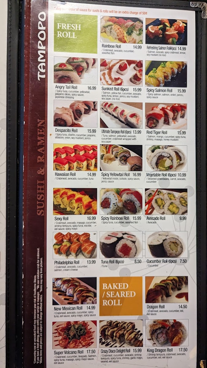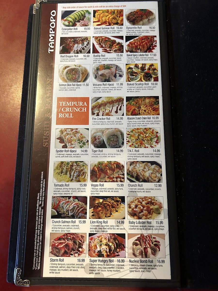 The menu at Tampopo Restaurant features a variety of traditional Japanese dishes, organized into several main categories to accommodate different dining preferences. Guests can explore an assortment of rice plates, tempura and crunch rolls, as well as sashimi, sushi, and roll combinations.